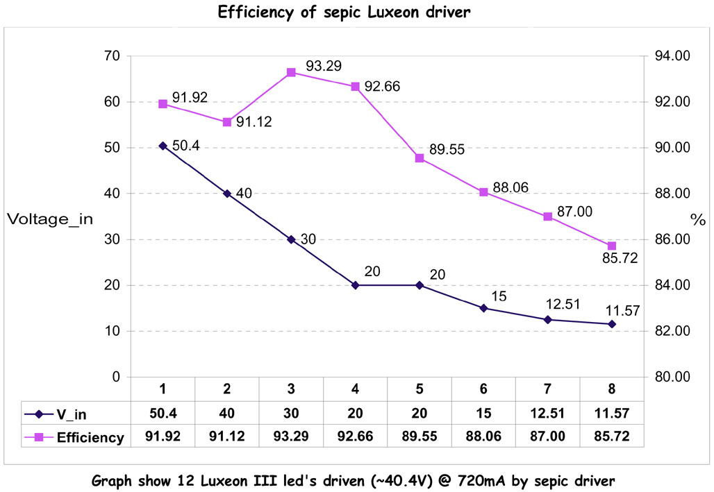 • Sepic  (Single-Ended Primary Inductance Converter) dc/dc converter for driving Luxeon  and Golden Dragon LED Led's from 10 to 32V and if demand for 48V. Sepic was chosen for ability to work from wide range of input voltages and Zero-Ripple on input.